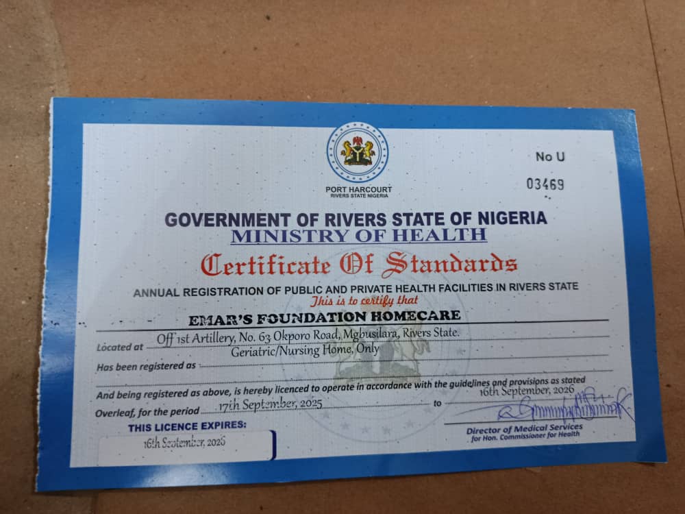 We’re excited to announce that Emar’s Foundation Home Care & E-Clinic has been officially approved and recognized by the Rivers State Ministry of Health. This approval marks a significant milestone, confirming our commitment to delivering safe, professional, and compassionate healthcare services directly in the comfort of your own home.